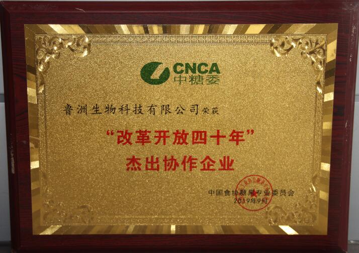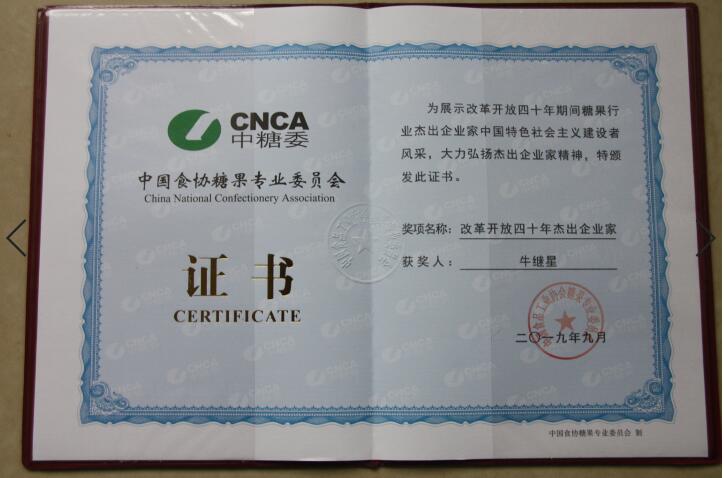 魯洲生物科技有限公司榮獲中國(guó)食協(xié)糖果專業(yè)委員會(huì) “改革開(kāi)放四十年”杰出協(xié)作企業(yè),董事長(zhǎng)牛繼星榮獲“改革開(kāi)放四十年”杰出企業(yè)家。